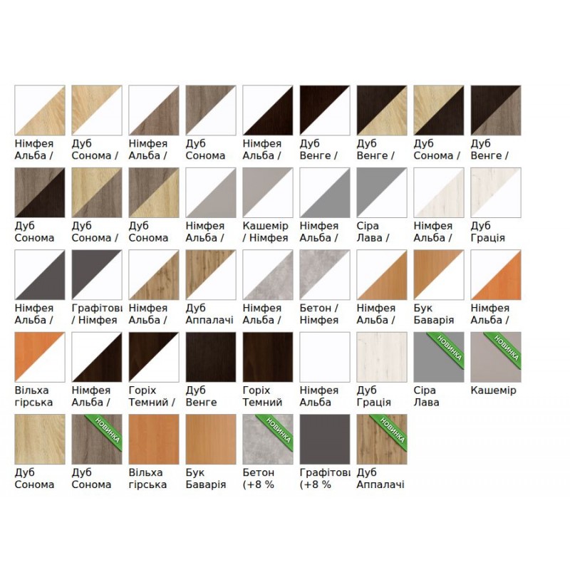 Матеріал - ламінована ДСП "Swiss Krono" 16 мм. Фурнітура - "DC", "Linken". Крайка: стільниця - ПВХ 2 мм; корпус - ПВХ 0,5 мм.