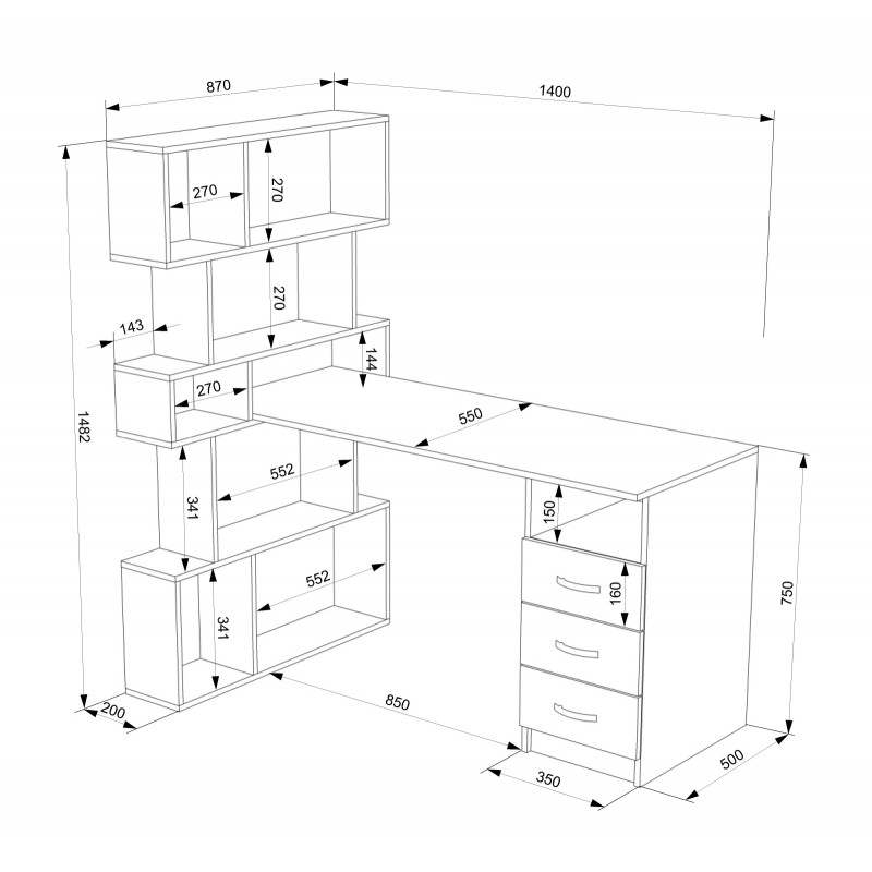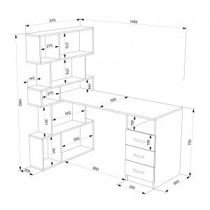 Розміри комп'ютерного столу: ширина - 1400 мм (140 см); глибина - 870 мм (87 см); висота - 1482 мм (148,2 см).