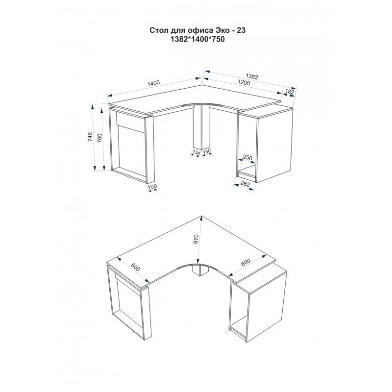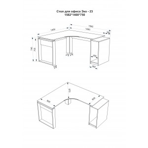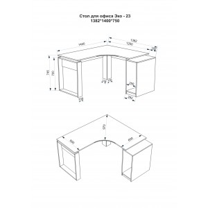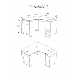 Розміри офісного столу: ширина - 1382 мм (138,2 см); глибина - 1200 мм (120 см); висота - 750 мм (75 см).