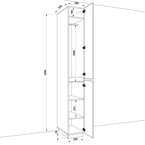 Розміри розпашної шафи: ширина - 300 мм (30 см); глибина - 550 мм (55 см); висота - 2200 мм (220 см).