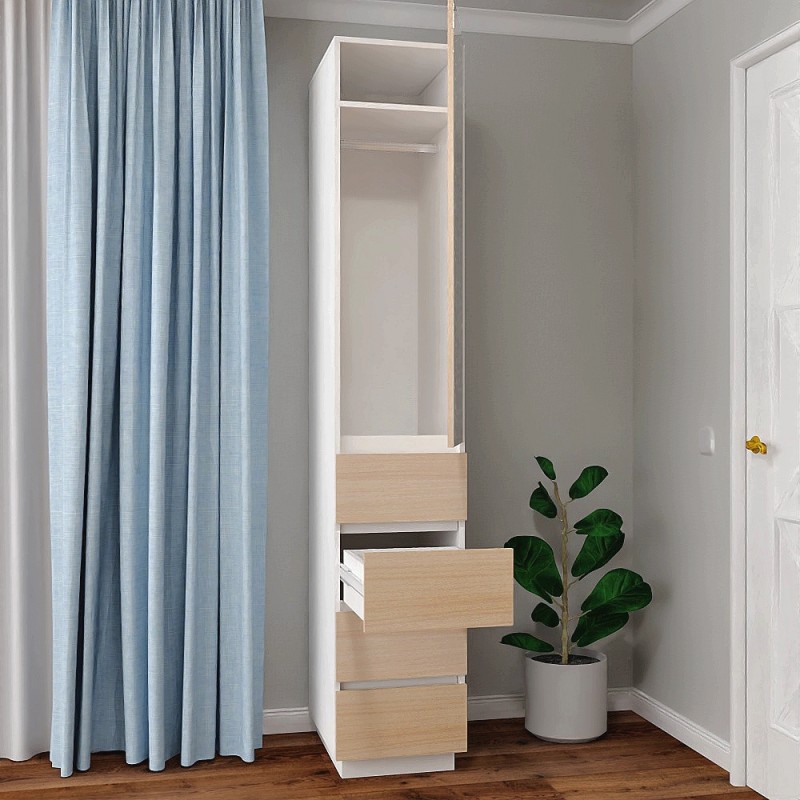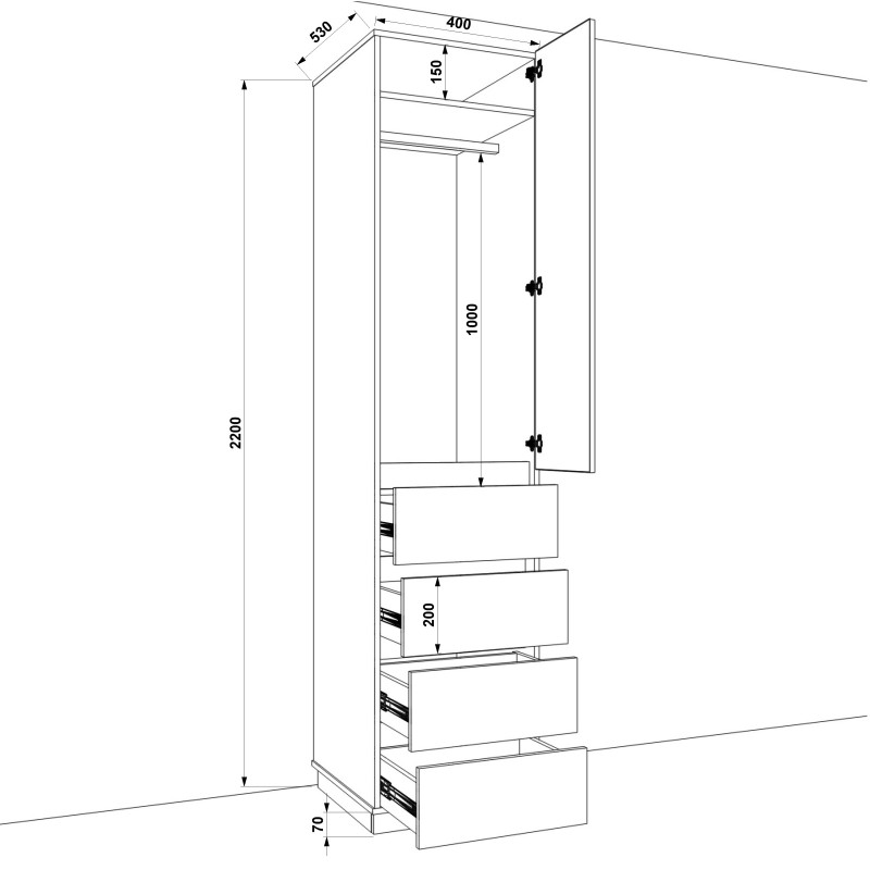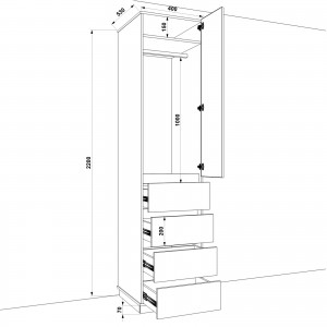 Розміри розпашної шафи: ширина - 400 мм (40 см); глибина - 550 мм (55 см); висота - 2200 мм (220 см).
